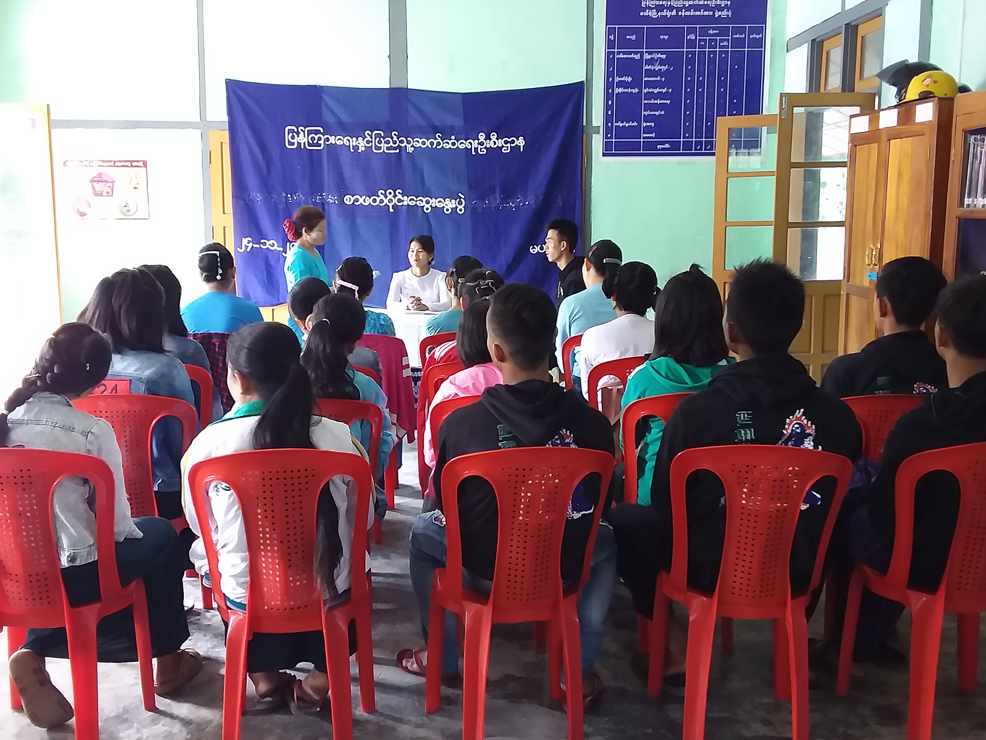 First, Daw Saw Wutyi, head of the township IPRD said that the group reading was conducted to help schoolchildren enjoy the essence of literature, to help them develop a habit of reading, to be able to share knowledge and wisdom gained from reading among them. Then, two members of Women club and a member of Youth Club lead the discussion about the book titled ‘ Think big, act honestly’ written by Bamaw Thein Pe, stressing the importance of having confidence, the way to achieve success by drawing lessons from the past failures and factors essential for achieving target.