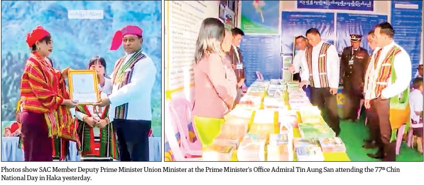 STATE Administration Council Member Deputy Prime Minister and Union Minister at the Prime Minister’s Office Admiral Tin Aung San, accompanied by SAC Member Union Minister for Border Affairs Lt-Gen Yar Pyae, SAC Members Dr Hmuh Thang and Dr Ba Shwe, Union ministers and deputy ministers, yesterday attended the 77th Anniversary of Chin National Day ceremony in Haka Township, Chin State.