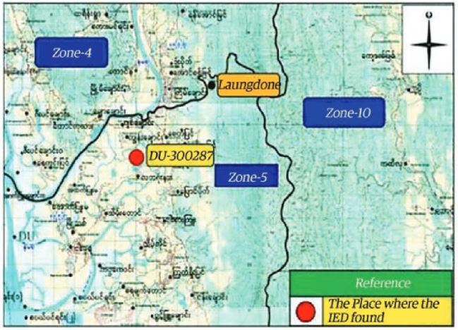 An improvised explosive device (IED) was discovered under the Laungdone Bridge near Sa-balgone Village on Laungdone- Ngakhuya road in Maungtaw Township on Friday, according to Myanmar Police Force.