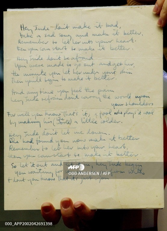 A sheet of paper bearing Paul McCartney's handwritten lyrics to "Hey Jude" sold for $910,000 in an online auction held Friday to mark the 50th anniversary of the Beatles' historic split.