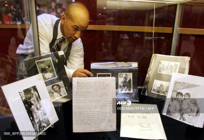 Other items included a drumhead with the Beatles' logo used during their first US tour gig in 1964, sold for $200,000, and a handwritten shooting script page for the "Hello, Goodbye" music video in 1967, fetching $83,200.