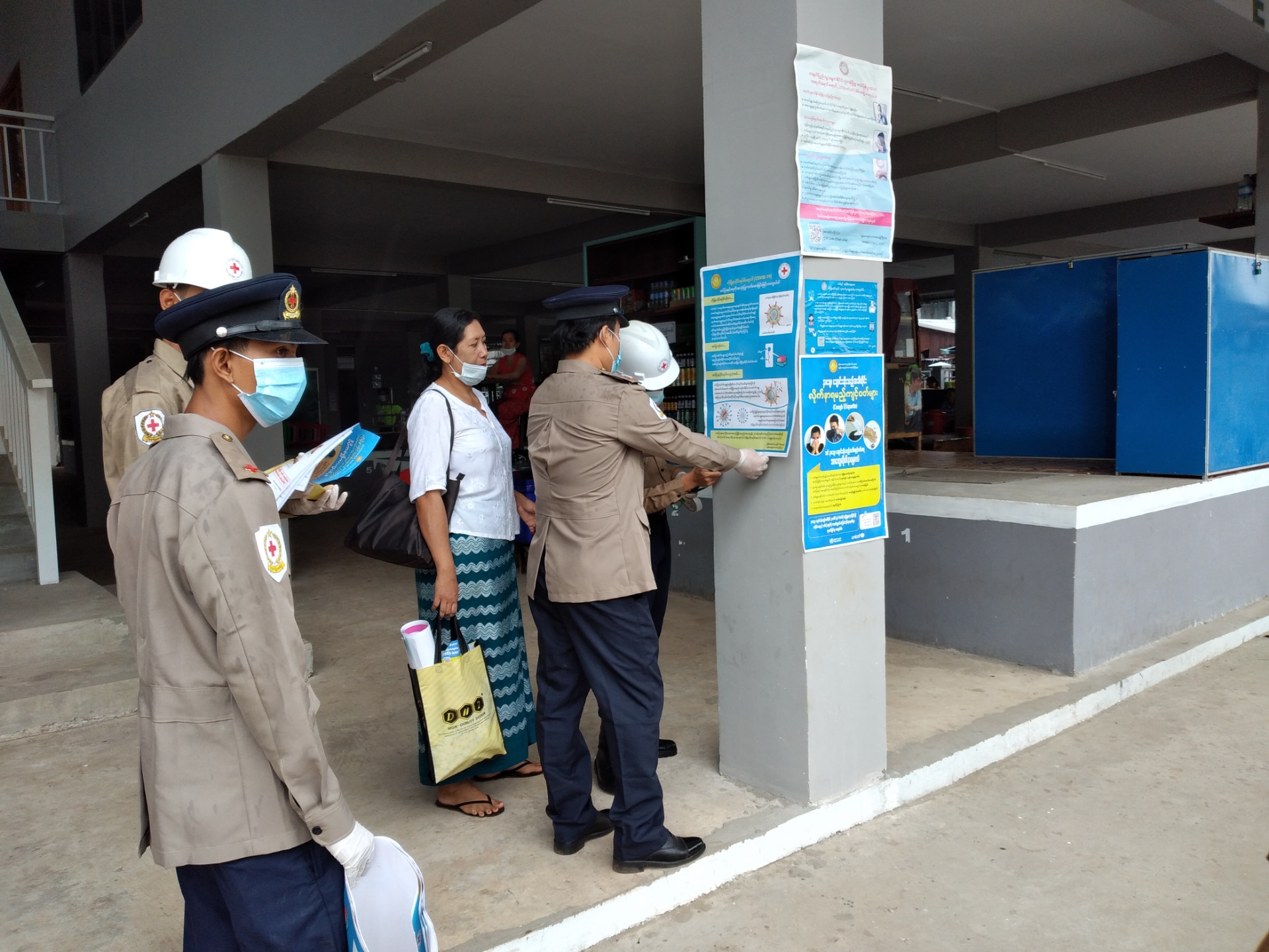 With the aim of preventing the spread of COVID-19, distribution of masks and pamphlets on the risks of COVID-19 was jointly conducted by departmental officials and members of Red Cross Society in front of the Kyaikmaraw Myoma Market this morning.