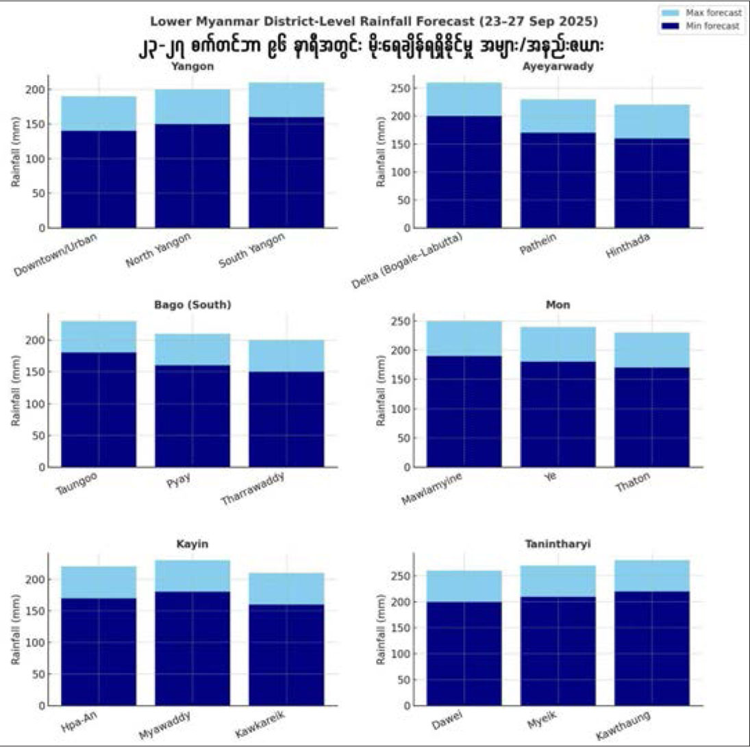 Due to a possible low-pressure area over the Bay of Bengal in four days (96 hours) from 23 to 27 Septem­ber, and the remnants of Super Cyclone Ragasa with expected landfall in China on or after 25 September, heavy rainfall may happen across Myanmar, especially Ayeyawady, Yangon, Bago regions, Kayin, Mon states and Taninthayi Region in four days, he said.