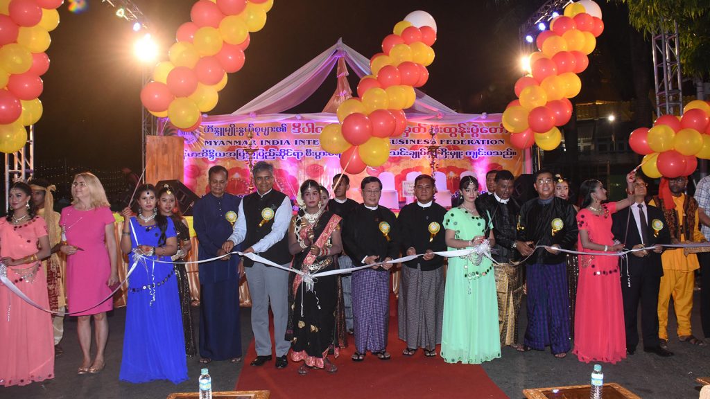 Union Minister U Thein Swe, Deputy Minister U Kyi Min, Rakhine Ethnic Affairs Minister U Zaw Aye Maung, Indian Ambassador, German Ambassador, Nepali Ambassador and Chairman of Myanmar India International Business Federation opened the event by cutting ceremonial ribbons and then posed for a group photo.