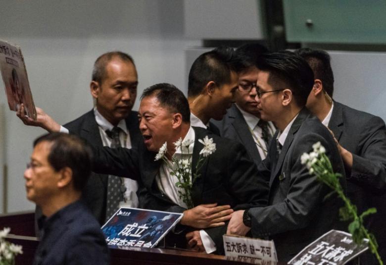 Pro-democracy lawmakers were dragged out of Hong Kong's legislature by security guards on Thursday after they heckled the city's pro-Beijing leader for a second day running, the latest outburst of political rancour in the strife-torn city.