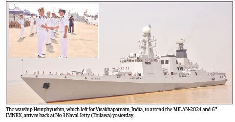 The warship Hsinphyushin, led by Captain Zaw Oo, which left for Visakhapatnam, India, to attend the Multilateral Naval Exercise (MILAN-2024) and 6th IMNEX, arrived back at No 3 Naval Jetty (Thilawa) yesterday.