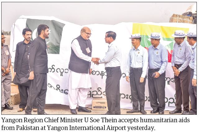 Likewise, another plane carrying tent, personal goods, tarpaulin sheets, medicines and instant foods weighing 31,301 kilogrammes from Pakistan in the second batch arrived at Yangon International Airport yesterday morning.