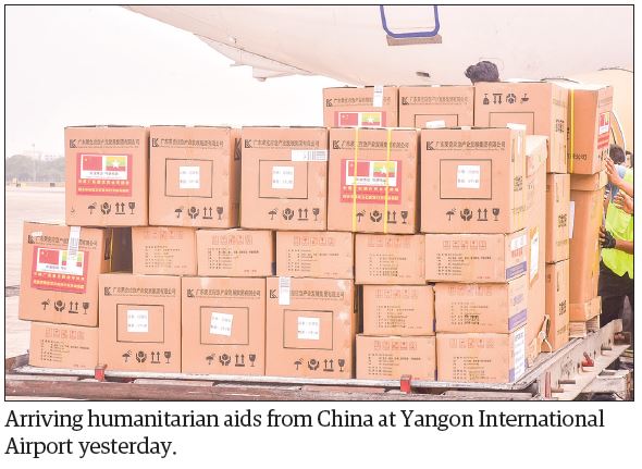 A plane carrying humanitarian aid comprising medicines and breathing apparatuses from China landed at Yangon International Airport yesterday morning.