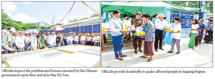 Out of 500 prefabricated offices donated by China, 340 arrived in the country and were used as temporary offices. Sim­ilarly, out of 4,500 prefabricated houses donated by China, 1,576 houses arrived at Thilawa Port on 9 May, while 1,804 on 13 May, and they were distributed to Sagaing Region, Mandalay Re­gion and Nay Pyi Taw.