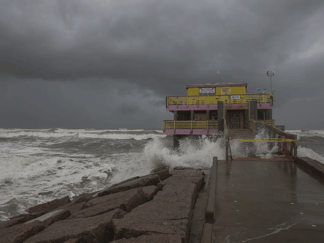 Aerial footage of a coastal town shows the roofs of many houses blown away by violent winds. It also shows flooded roads and buildings.