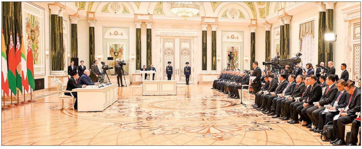 I would like to extend my warm greetings to all the participants of this event, including the President of Belarus, Mr President, the delegation members, and media representatives. Everybody, Mingalaba! I also had the privilege of meeting and discussing matters with the President and government officials during my second visit. I am happy to say that it was a successful trip. To further strengthen and develop the Belarus-Myanmar friendship, and to enhance collaboration, I wish to express my gratitude to President Lukashenko and the responsible individuals, as well as the people of Belarus, and wish for continued strength, progress, and development. During today’s meeting, as we discussed openly and clearly, we will continue to strengthen and carry out cooperation in various sectors such as the economies of both countries, agriculture, industry, education, science and technology, culture, and defence. Not only the government-to-government relations but also the people-to-people relations will be expanded. For the successful implementation of the cooperation between the two countries, the involvement of not only government officials but also the media in the relevant sectors is crucial. Therefore, I kindly request your cooperation in this matter. Our country is the largest landlocked country in Southeast Asia. It is a country that is situated between two of the most populous countries in the world, China and India, and also acts as a bridge between Southeast Asia and South Asia.