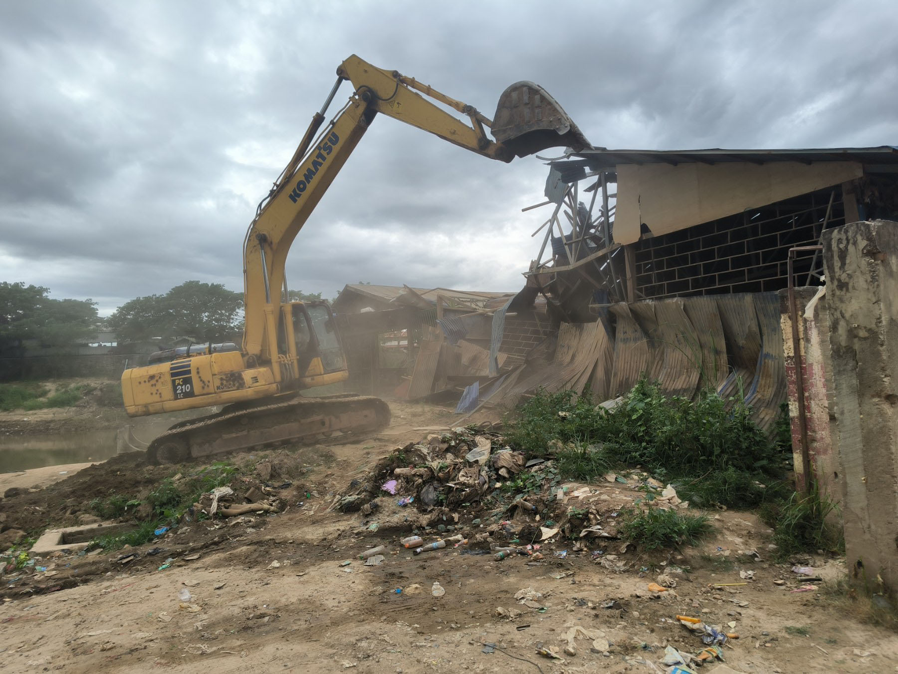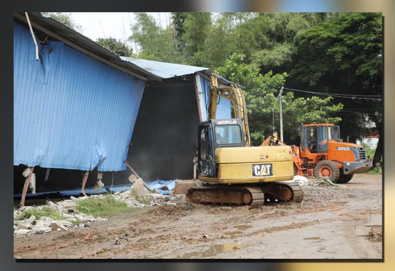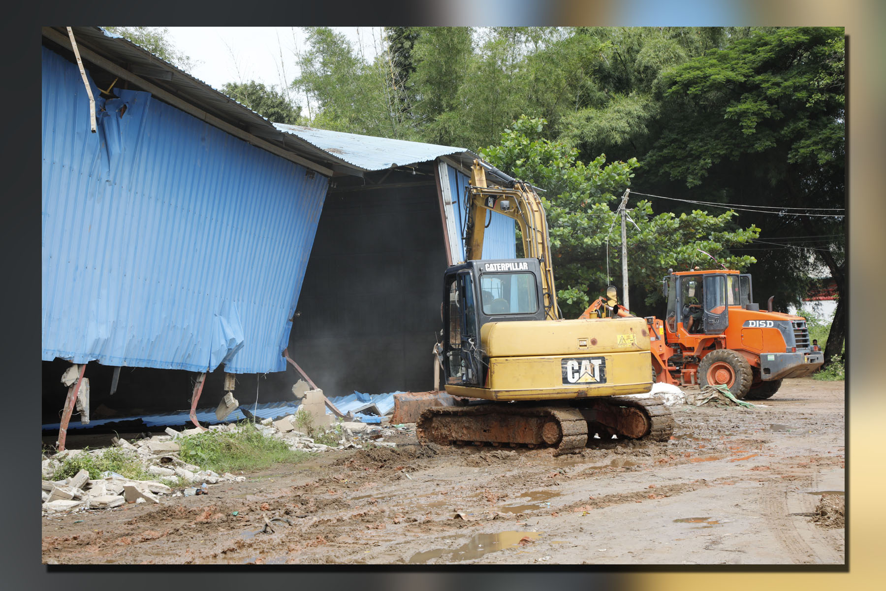 During the demolition operation, the security and demolition teams, along with machinery, vehicles, and equipment, inspected the Subgate-35 area — also domestically known as Aung Power Gate-2 — in Ward No 5 of Myawady yesterday morning and demolished a warehouse measuring 120 feet long, 60 feet wide, and 25 feet high.