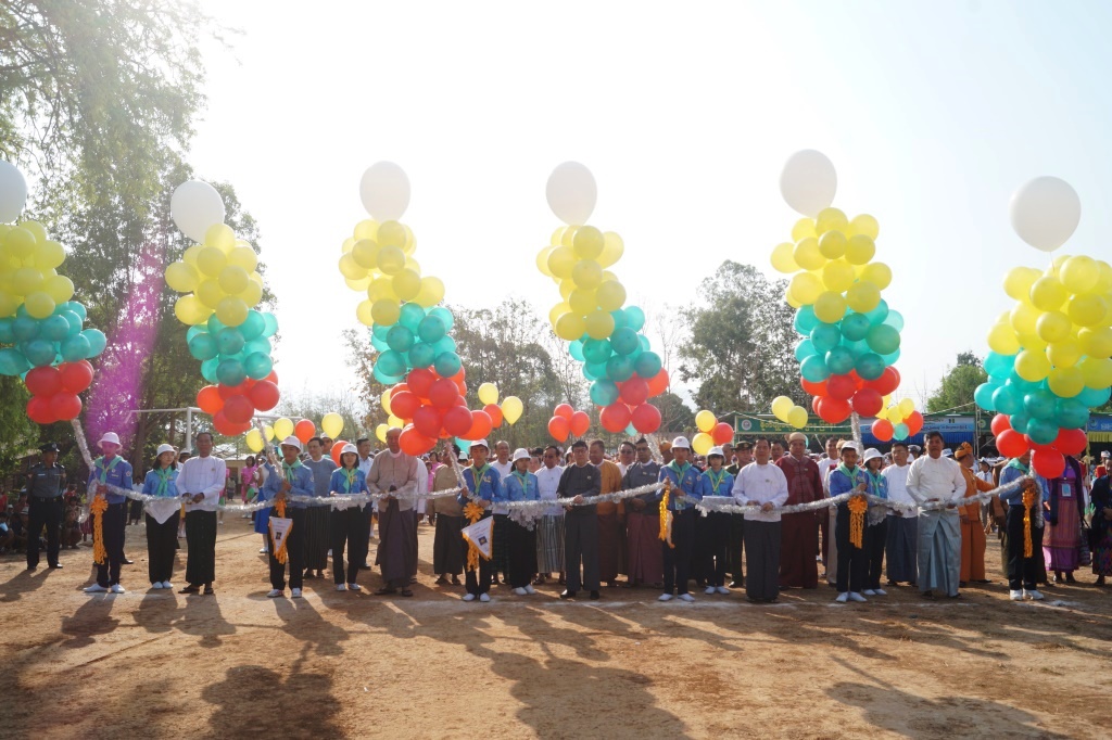 Speaker of Shan State parliament U Sai Lone Hsai, Deputy Minister for Education U Win Maw Tun, Shan State Minister for Social Affairs Dr. Myo Tun, Deputy Director-General of the Department of Basic Education Dr. Tin Maung Win and the in-charge of the vacation camp cut a ceremonial ribbon to open the camp. Next, Union Ministers U Thant Sin Maung, U Win Khaing and U Han Zaw and Chief Minister for Shan State Dr. Lin Htut unveiled the signboard of the vacation camp.