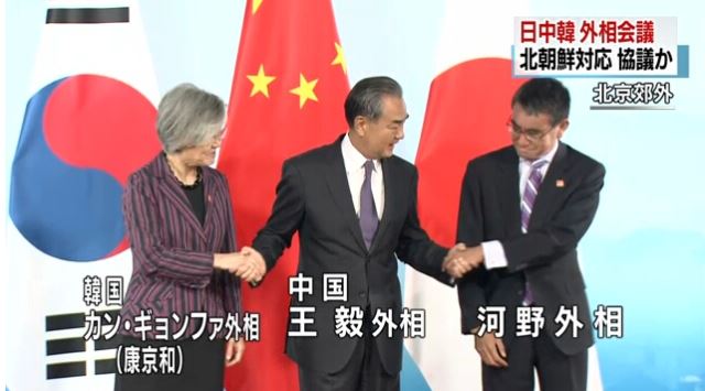 Japan's Foreign Minister Taro Kono and his Chinese and South Korean counterparts, Wang Yi and Kang Kyung-wha, met in the suburbs of Beijing on Wednesday.