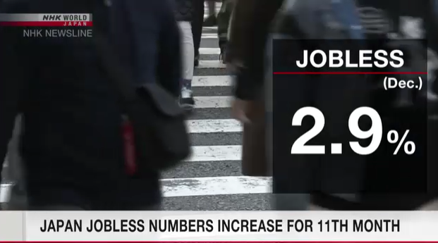 The latest data from the Japanese government shows that the number of people out of work grew by 490 thousand in December compared with a year earlier.