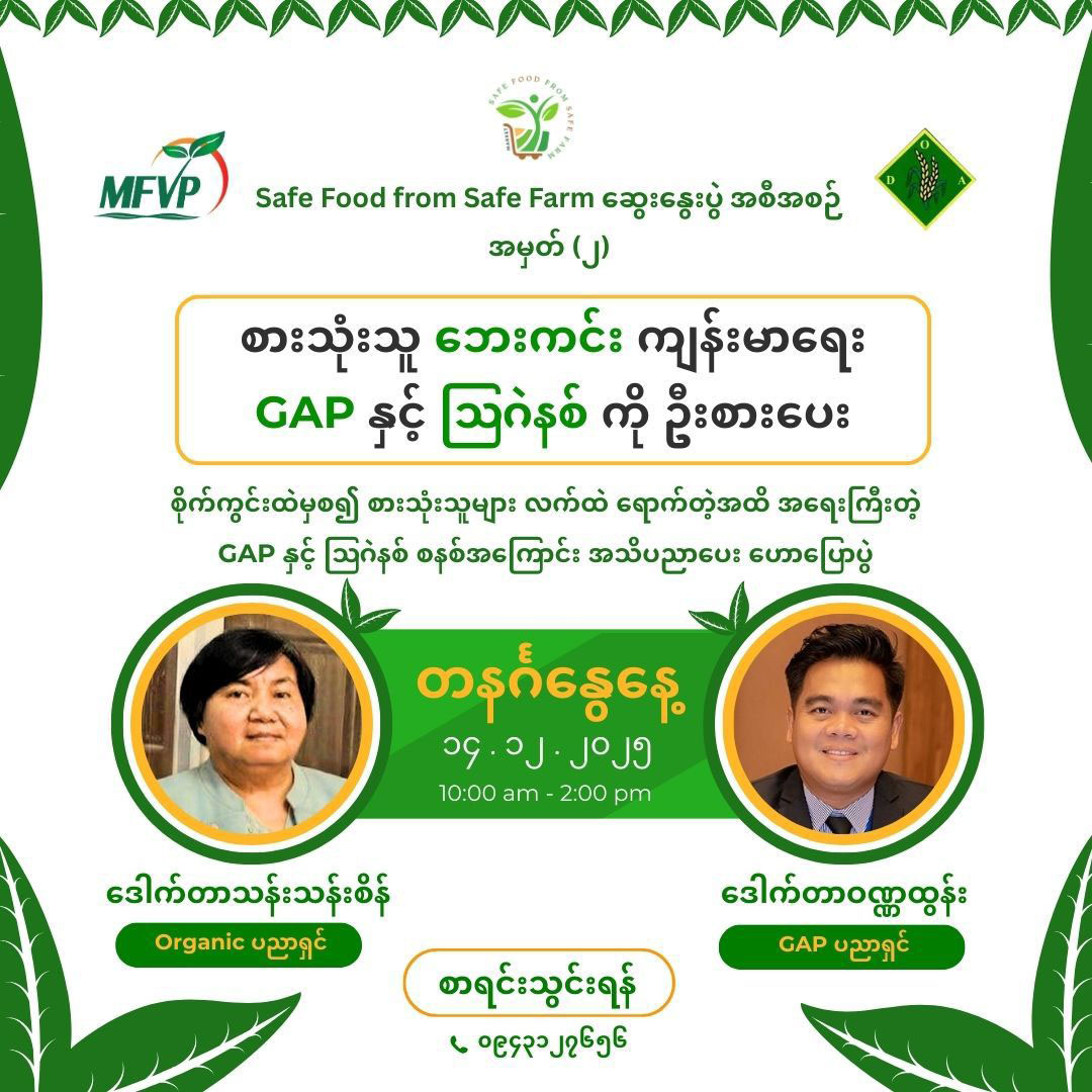 PRIORITIZING Good Agricultural Practices & Organic Food for Consumer Health and Safety” seminar is scheduled to take place from 10 am to 2 pm on 14 December in Myaypadethakyun, Kandawgyi, according to the Myanmar Fruit, Flower and Vegetable Producers and Exporters Association (MFVP).