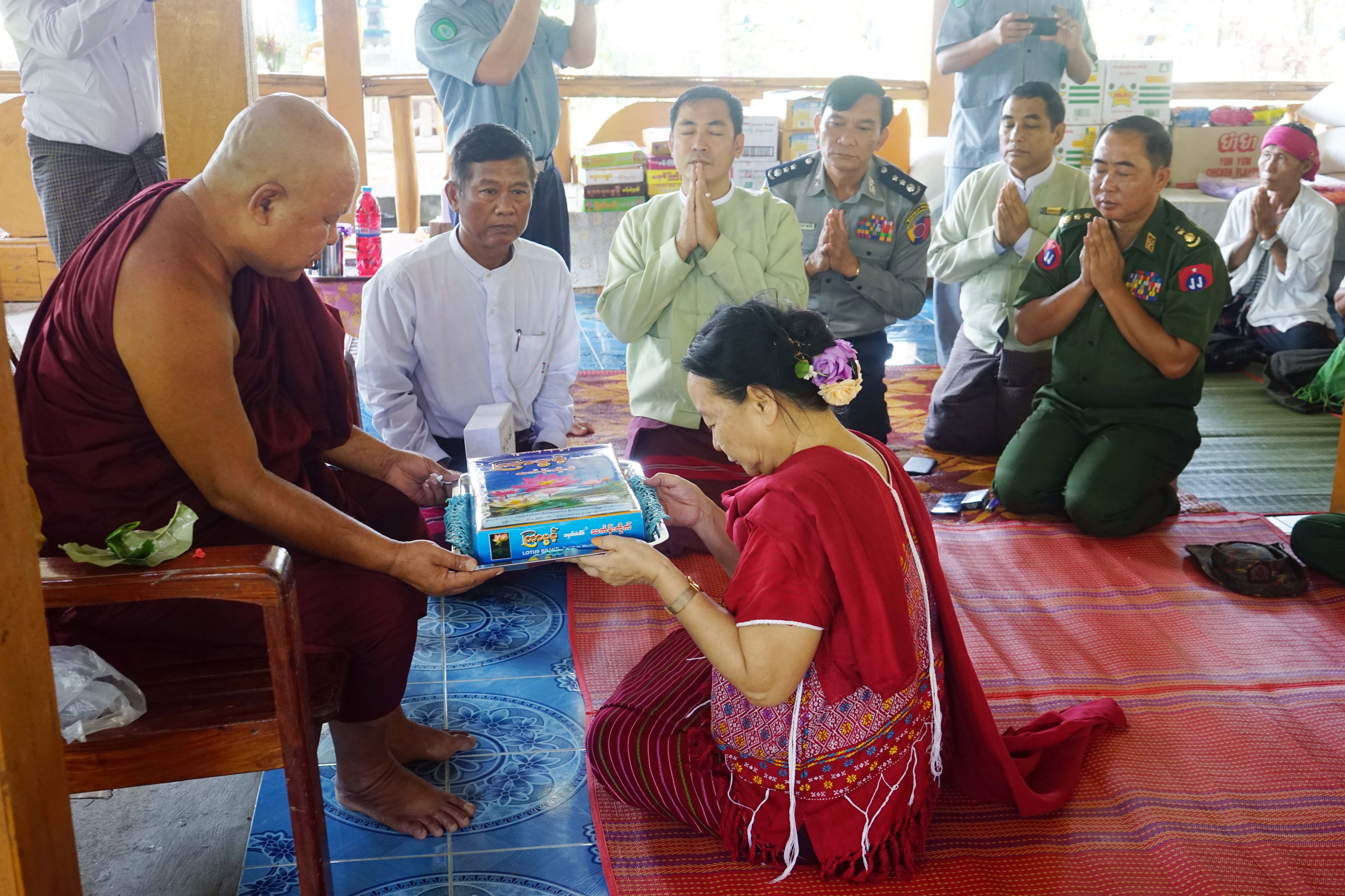 The chief minister and her entourage first paid homage to presiding Sayadaw of Myainggyeengu Nan Oo monastery and donated offertories to the monk. They also furnished the members of the splinter group, who returned to the legal fold with Ks. 9 million, rice, cooking oil, instant noodles, and clothing. Kayin State Minister for Security and Border Affairs Col Myo Min Naung contributed Ks. 4.95 million donated by the Ministry of Border Affairs to the a 45-memebr KKO splinter group led by Saw Tin Myint with the rank of captain.