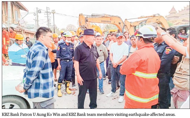 KBZ Bank Limited has been actively carrying out emergency relief efforts in the earthquake- affected areas of Taunggyi, Shwenyaung, Aungban, and Inlay in southern Shan State. Staff from various KBZ Bank branches have been providing immediate relief assistance in response to urgent needs. A team from KBZ Bank, led by Patron U Aung Ko Win, visited the affected areas immediately after the earthquake.
