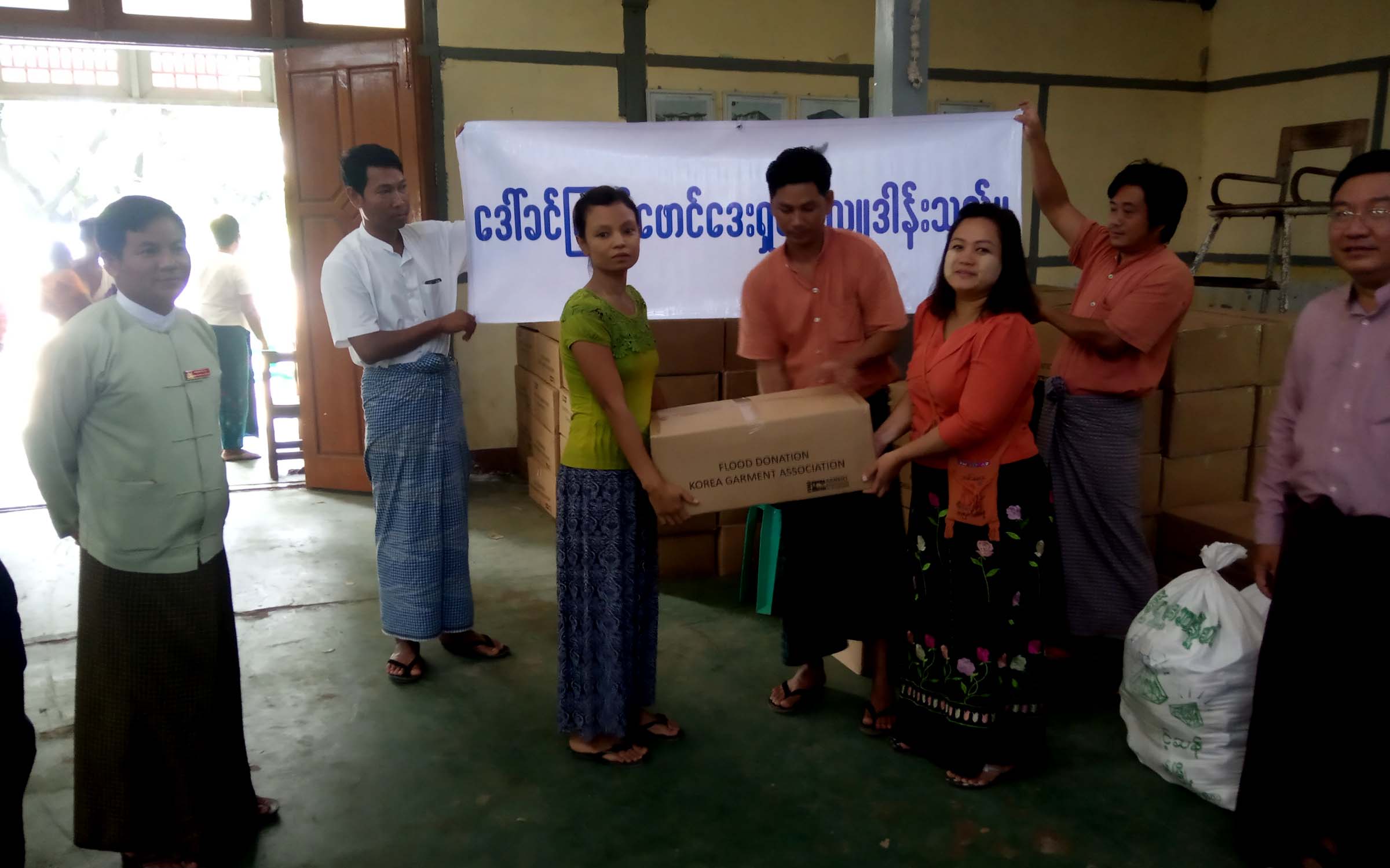 Officials from the Daw Khin Kyi’s Foundation handed over relief items provided by Korea Garment Association to flood victims who were in temporary rescue camp in Ward-4 in Zeegon Township, Tharawady District, Bago Region this morning.
