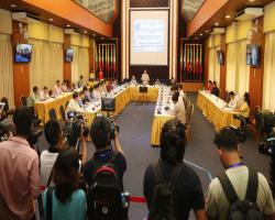 A meeting between Dr. Win Myat Aye, UEHRD Vice Chairman (1), UEHRD committee members and Task Forces was held at the National Reconciliation and Peace Center in Yangon yesterday afternoon. Dr. Win Myat Aye is also the Union Minister for Social Welfare, Relief and Resettlement. (UEHRD – Union Enterprise for Humanitarian Assistance, Resettlement and Development in Rakhine).