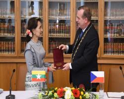 State Counsellor Daw Aung San Suu Kyi who was in Prague, the Czech Republic went to Charles University in the afternoon of 3 June and was welcomed by Rector Dr. Tomas Zima and officials.