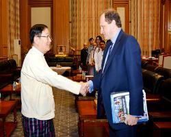 Pyithu Hluttaw Speaker U T Khun Myat received the EU Electoral Follow-up Mission-EFM led by Mr. Alexander Graf Lambsdorff, at the Pyithu Hluttaw in Nay Pyi Taw yesterday.