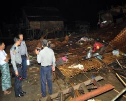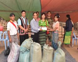 Shan State Minister for Lahu Ethnic Affairs U Yaw Thet met fire victims and presented relief supplies to them in Namtwoehtaung Village, Mongphyat Township in Eastern Shan State yesterday evening.