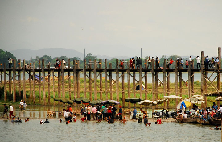 A 3967ft-long wooden bridge with 482 compartments and 1086 posts in the water was built 168 years ago. Now it has been put in the World Heritage List. But it is sad that the name of Taungthaman Bridge has disappeared. The name of Taungthaman Bridge is an original one by itself.