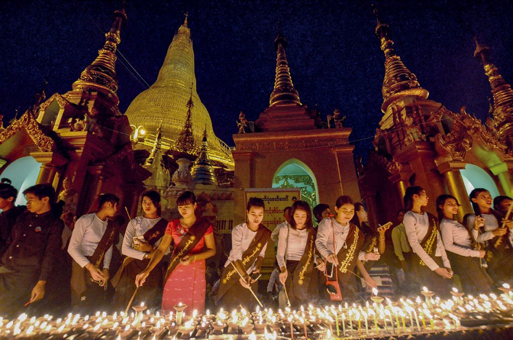 Light Festival of Thidin Kyut lasts three successive nights the 14th waxing moon day, the 15th Full moon day and 1st waning moon day. On the 1st waning day begins Puja festival Myanmar Buddhists have Five Categories whom you owe infinite gratitude namely (1). The Buddha, the Dhamma, the Samgha, Parents Acariya [Teachers, Superiors, Bosses, etc.]. So on the 1st waning moon of this month Acariya Pujas are held across the country, school, colleges, Universities, Government Ministries, Departments, Companies Armed Forces Army, Navy and Air. Regardless of race, religion, rank and creed all hold and participate in such pujas.