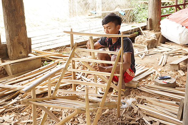 Then, we make toddy chairs in Katha township. We need four people to make the toddy chairs. One person fixes the toddy chair and the remaining three sell them by delivering them on motorbikes in the villages and in towns.