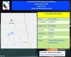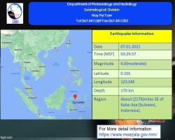 Local Weather Local Wealther Cyclonic Storm “DANA” News, No 8, 2024 Weather 24/10/24 Deep Depression News, No 4, 2024 Weather 23/10/24 Well Marked Low-Pressure Area Condition Weather 22/10/24 Moderate earthquake hits Kalay District Weather 02/05/22 Slight earthquake strikes Kyaukphyu Twsp Weather 29/01/21 Slight earthquake jolts Khamti Twsp Weather 28/01/21 Slight earthquake shakes Thabeikkyin Twsp Weather 27/01/21 Slight earthquake jolts Nay Pyi Taw Weather 22/01/21 Slight earthquake hits Sinbo Twsp Weather 18/01/21 Strong earthquake jolts outside Myanmar Weather 07/01/21 Pagination First page « First Previous page ‹ Previous Page 1 Current page 2 Page 3 Page 4 Page 5 … Next page Next › Last page Last » Most read news Observers from Russia, China, India, Vietnam arrive in Yangon ahead of 2025 General Election Local 27/Dec/2025 UEC Chairman receives Belarus CEC Deputy Chairman Local 27/Dec/2025 Bagan’s Mahabodhi Pagoda renovation by ASI India around 80% complete Culture & Travel 27/Dec/2025 Retired US Army Colonel: Myanmar’s Elections Give Washington A Chance To Reset Decades-Stalled Ties Political 26/Dec/2025 Cambodia earns 9.71 bln USD from exports to ASEAN, EU in first 11 months of 2025 International 24/Dec/2025