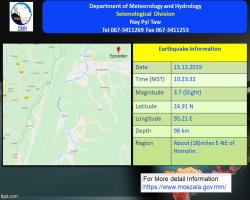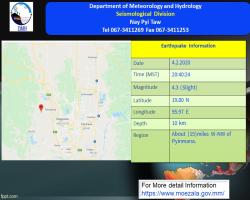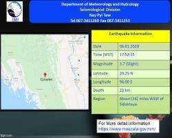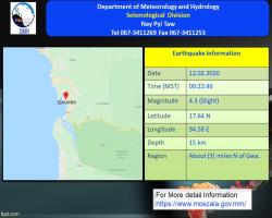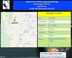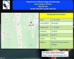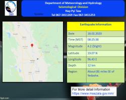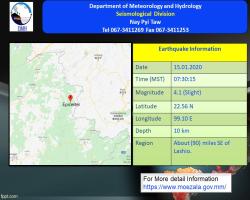 Local Weather Local Wealther Slight earthquake strikes Sedoktaya Township Weather 01/03/20 Slight earthquake jolts Yedashe Township Weather 18/02/20 Slight earthquake jolts Gwa Township Weather 12/02/20 Slight earthquake rocks Pauk Township Weather 05/02/20 Slight earthquake jolts Nay Pyi Taw Weather 05/02/20 Slight earthquake jolts Minkin Township Weather 21/01/20 Slight earthquake hits near Kengtung Weather 15/01/20 Slight earthquake strikes Magway Region’s Sedoktaya Township Weather 07/01/20 Slight earthquake strikes Sagaing Region’s Homalin Township Weather 15/12/19 Slight earthquake hits Nay Pyi Taw Weather 12/12/19 Pagination First page « First Previous page ‹ Previous … Page 3 Page 4 Current page 5 Page 6 Page 7 … Next page Next › Last page Last » Most read news Observers from Russia, China, India, Vietnam arrive in Yangon ahead of 2025 General Election Local 27/Dec/2025 UEC Chairman receives Belarus CEC Deputy Chairman Local 27/Dec/2025 Bagan’s Mahabodhi Pagoda renovation by ASI India around 80% complete Culture & Travel 27/Dec/2025 Retired US Army Colonel: Myanmar’s Elections Give Washington A Chance To Reset Decades-Stalled Ties Political 26/Dec/2025 Cambodia earns 9.71 bln USD from exports to ASEAN, EU in first 11 months of 2025 International 24/Dec/2025