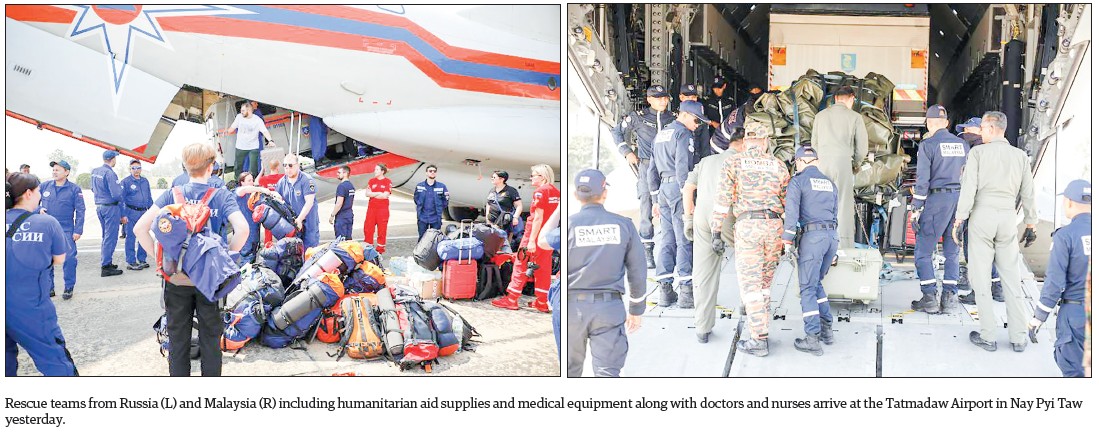 Nay Pyi Taw Tatmadaw Airport admitted search and rescue teams including humanitarian aid supplies and medical equipment along with doctors and nurses from Malaysia and Thai rescue teams. Russia also sent search and rescue teams, medical personnel, four rescue dogs and relief supplies.
