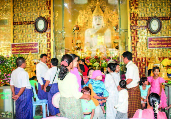 At the Mahamuni Buddha Image, the sacred image was displayed to devotees via an LED board, allowing pilgrims to offer homage with flowers and offerings. Religious ceremonies also took place at other prominent religious sites, including Sutaungpyae Pagoda on Mandalay Hill and Maha Thakyamarazein Pagoda near the foot of the hill.