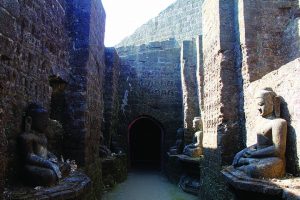Then, on the way back, Prince Pei Phru vowed that if he was powerful enough to repel the attacks of the Pyus, that region would be wrapped in darkness for seven days and that two war-boats fully manned with armed soldiers would come into his presence. Due to his power, Devas were motivated by his vow. So they created two war-boats with soldiers holding swords and spears and sent them to him. The whole region was engulfed in darkness for seven days. Prince Pei Phru, in the guise of a ferry-man, carried Pyu soldiers in boats and killed them and heaped their bodies on a mountain across. When seven days had gone by, darkness dispersed. To know where his men gathered, Pyu soldiers ascended the Pyaing Mountain and looked across and saw the dead bodies of their men piled up on a mountain on the opposite bank. Only then did they realize that Prince Pei Phru had killed their men by devising a stratagem. So the Pyu king and his soldiers fled to their city. When King Amratu heard of his nephew’s great power and victory over the Pyus, he, choked by fear vomited blood and died. Upon his death, Prince Pei Phru was made King of Vesali. The new king moved the capital to the site of Mrauk U village and renamed it ‘ Mrauk U’ to commemorate this great victory and because it was the place where his first undertaking was crowned with success ( Mrauk means ‘ accomplish’ and ‘U’ means ‘ first’).
