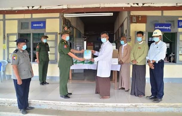 The regional MP U Khin Maung Lwin, township administrator U San Tun, township public health department head Dr. Htin Kyaw and Members of the township committee on Covid-19 prevention, containment and treatment received the medical aids donated by the central command and gave back the donors a certificate of honour in appreciation of the donation.