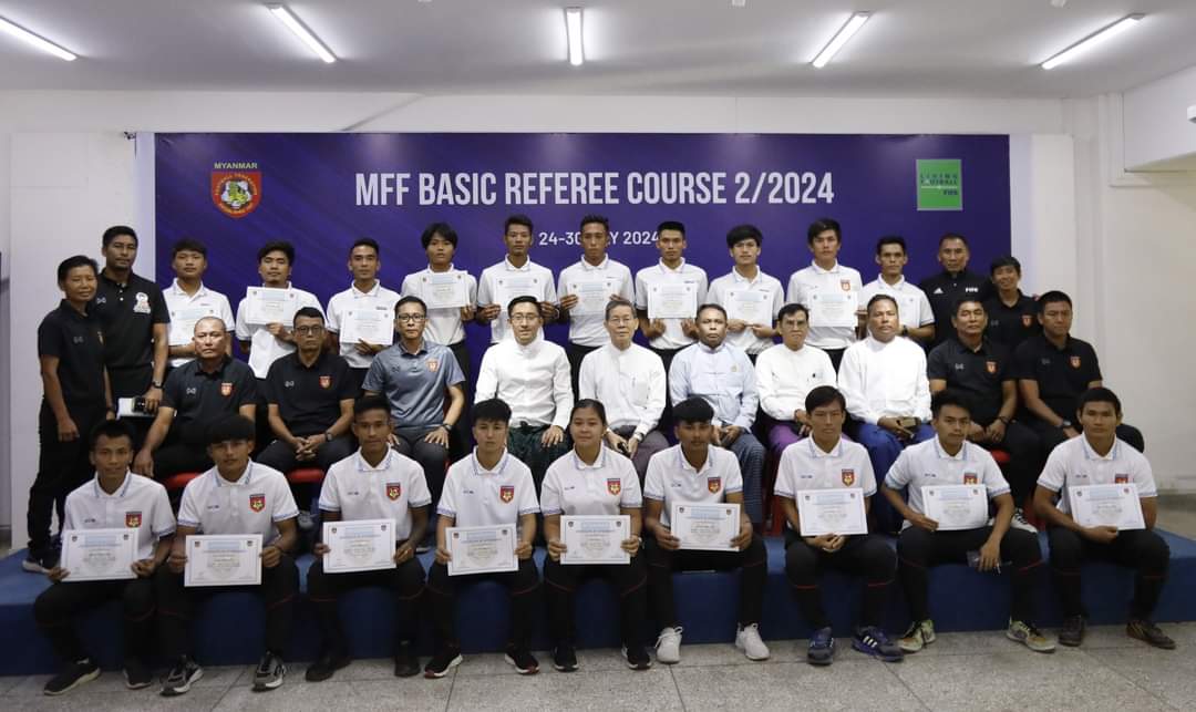 The graduation event for the MFF Basic Referee Course 2/2024, jointly organized by the Myanmar Football Federation and the Referee Committee, was held at the press conference hall of Thuwunna Youth Training Centre in Yangon on 30 May.