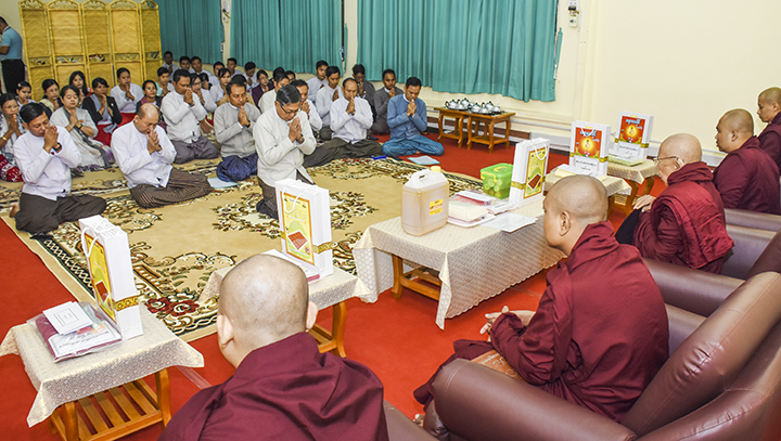The congregation led by Union Minister U Kyaw Tint Swe received the Five Precepts from Pyinmana Maha Visuta Yama Zaygon Monastery Sayadaw Abhidhajamaharatthaguru Dr Bhaddanta Kavithara and other Sayadaws.