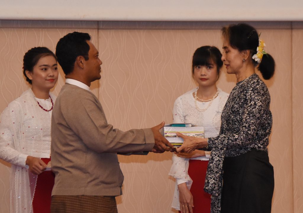 State Counsellor Daw Aung San Suu Kyi made a speech at the ceremony, and provided the students and school children of staff families with cash and stationaries.