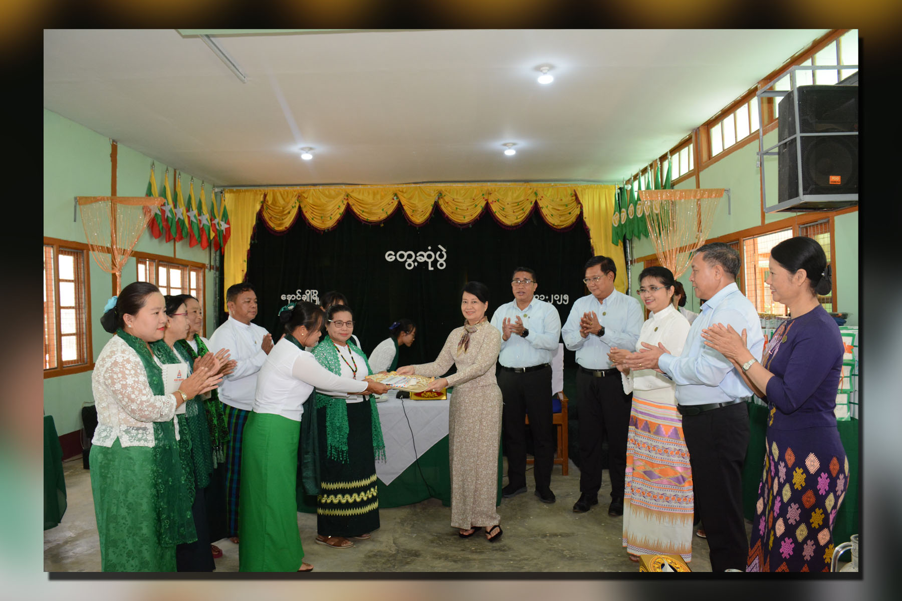 On arrival at No 1 BEHS in Nawnghkio Township, the Union minister met teachers, students and parents. She then presented cash prizes to the teachers and students.