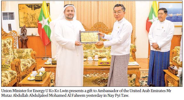 Union Minister for Energy U Ko Ko Lwin met Mr Mutaz Abdullah Abduljaleel Mohamed Al Faheem, Ambassador of the United Arab Emirates to Myanmar, in Nay Pyi Taw yesterday.