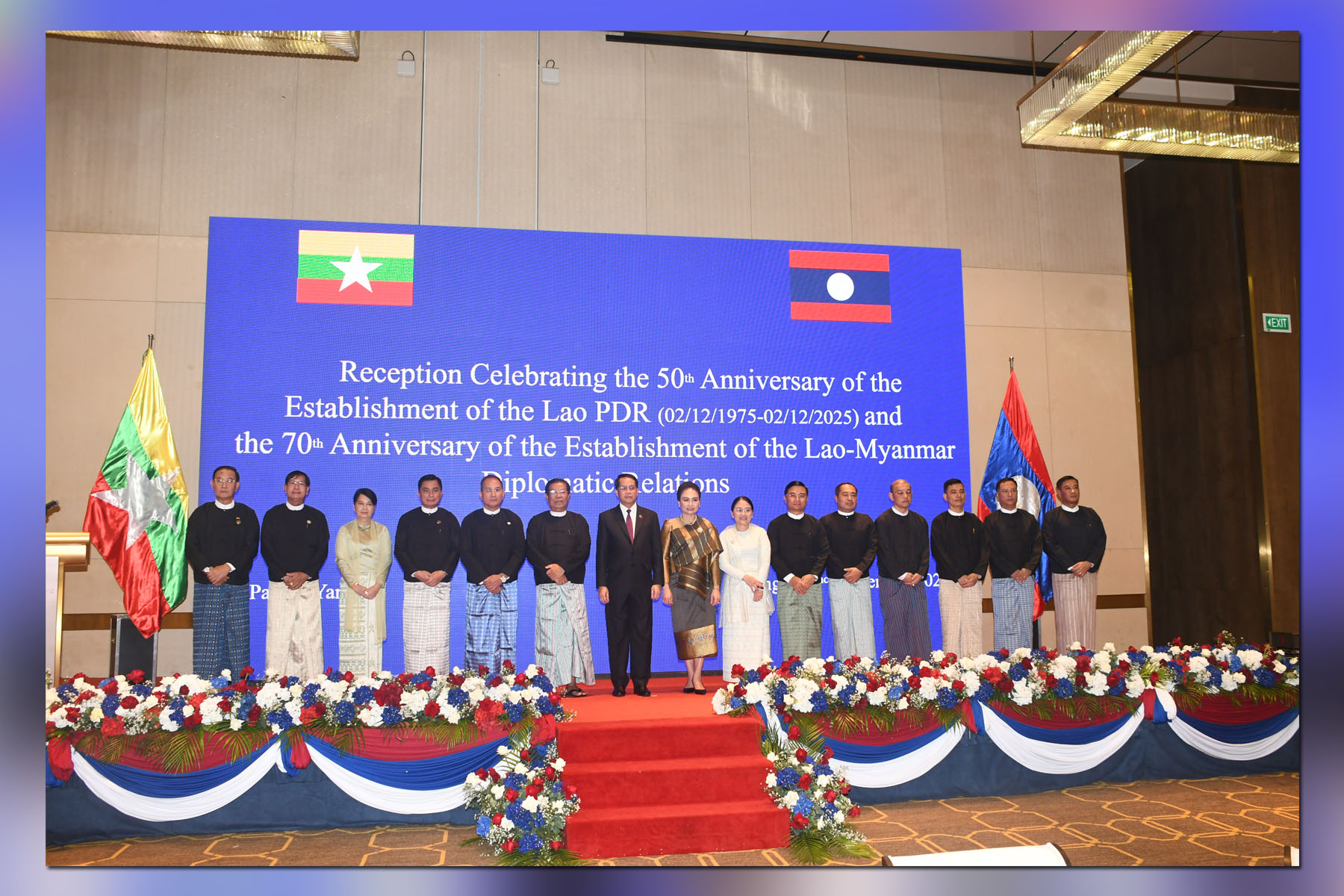 The Union minister and the ambassador cut a cake commem­orating the 50th anniversary of the founding of the Lao People’s Democratic Republic and the 70th anniversary of the establishment of diplomatic relations between Myanmar and Laos, and they posed for a group documentary photo with the guests attending the reception. Afterwards, the ambassador hosted a dinner for the attendees.