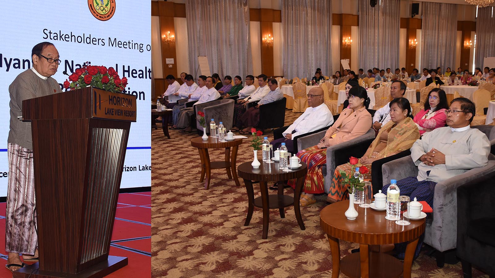 Union Minister Dr Myint Htwe delivered a speech at the meeting in the Horizon Lake View Hotel in Nay Pyi Taw.