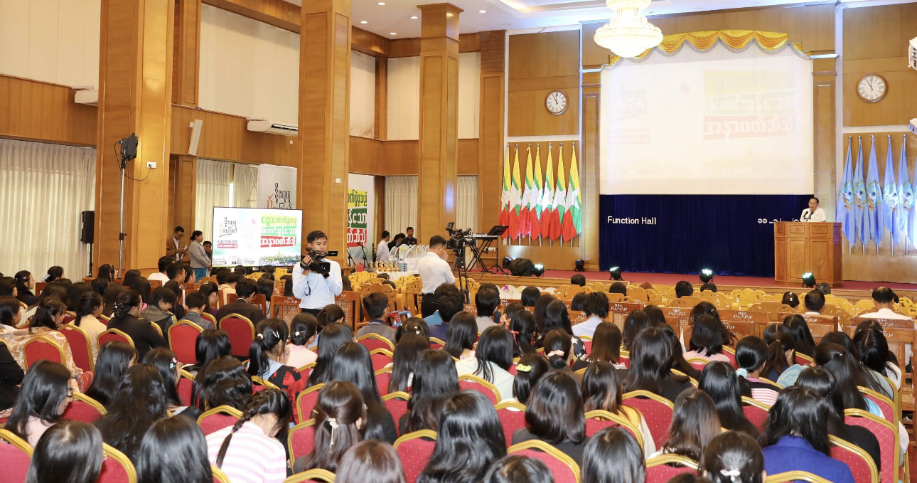 During the campaign at the Naypyitaw State Academy, Union Minister for Information U Maung Maung Ohn distributed the pamphlets that carry electoral mottos to the students and attendees.