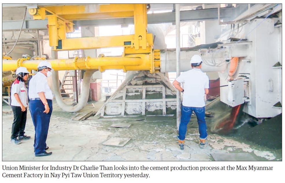 UNION Minister for Industry Dr Charlie Than inspected the ce­ment production process at the Max Myanmar Cement Factory in Nay Pyi Taw Union Territory yesterday afternoon.
