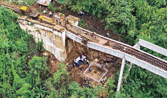 During the inspection of the Gokteik viaduct, the Union min­ister heard the report on repair works forwarded by Myanma Railways officials, and instruct­ed the need to reconstruct the bridge in its original style, meet the standards, complete in time and ensure the safety in work­places. He then inspected the destroyed railways, concrete sleepers and locations exploded by the terrorists in the 350-foot-long tunnel near the bridge. He also presented cash prizes to the staff and security force members.