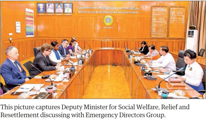 Deputy Minister for Social Welfare, Relief and Resettlement U Soe Kyi met New York-based Emergency Directors Group (EDG) of UN agencies and hu­manitarian agencies at the min­istry in Nay Pyi taw yesterday morning.