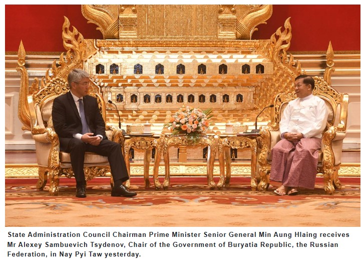 Chairman of the State Administration Council Prime Minister Senior General Min Aung Hlaing received a delegation led by Government of Russia’s Buryatia Republic Chair Mr Alexey Sambuevich Tsydenov, at the Credentials Hall of the Office of the SAC Chairman in Nay Pyi Taw yesterday morning.