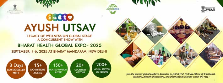 The AYUSH UTSAV 2025 is simultaneously held with the Bharat Health Global Expo 2025. Products of iPHEX, India MedTech, Ayush Utsav, Pharma Mach Tech, Lab Next Expo, Sanjeevani and Neutraverse will be showcased.