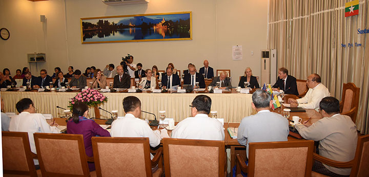 Union Minister U Thaung Tun and EU Ambassador Kristian Schmidt presided over the dialogue which was also attended by Deputy Minister for Planning and Finance U Set Aung, the ambassadors of EU member states, officials from these embassies, the representatives and the heads of development cooperation, and senior departmental officials.